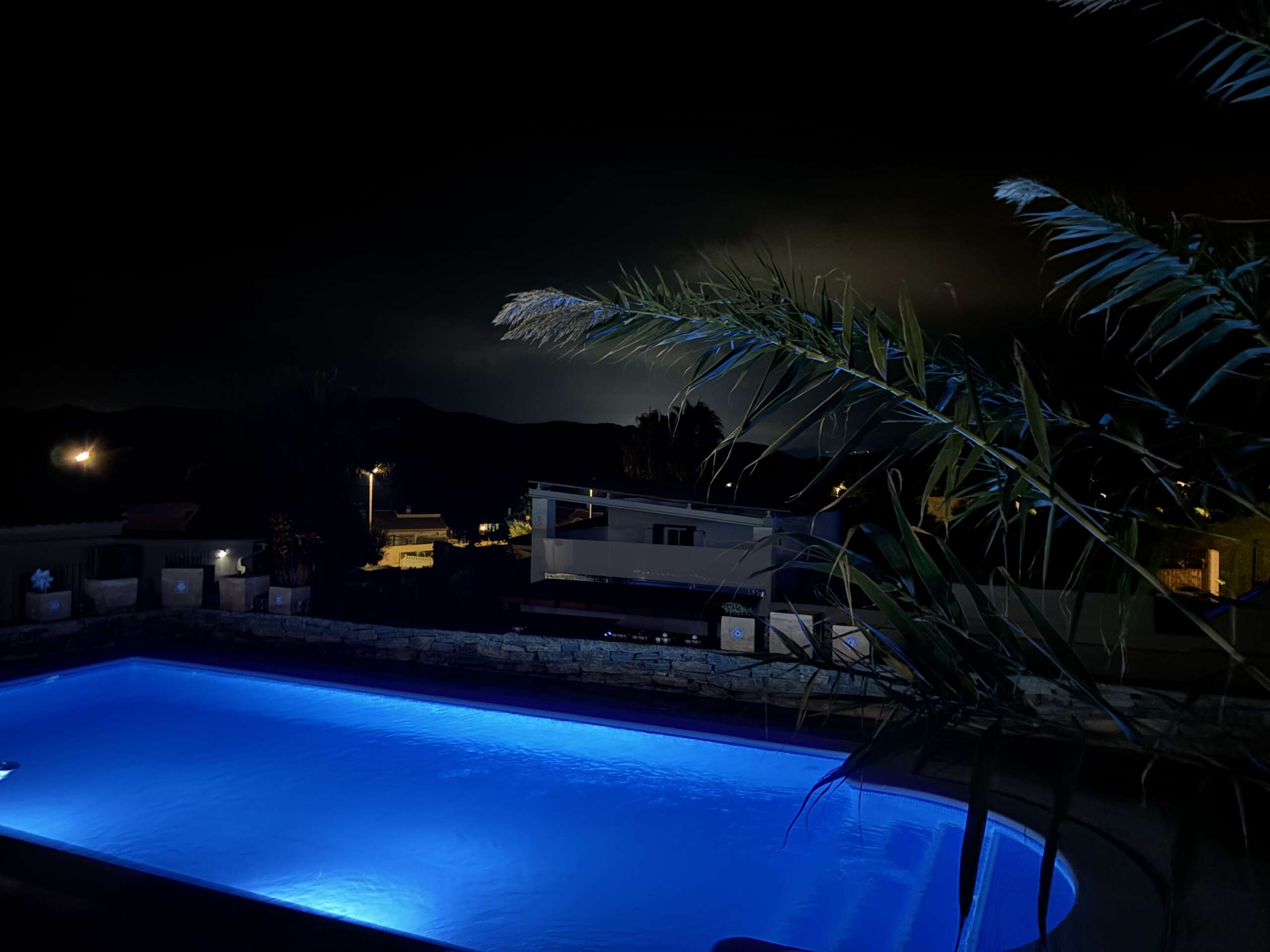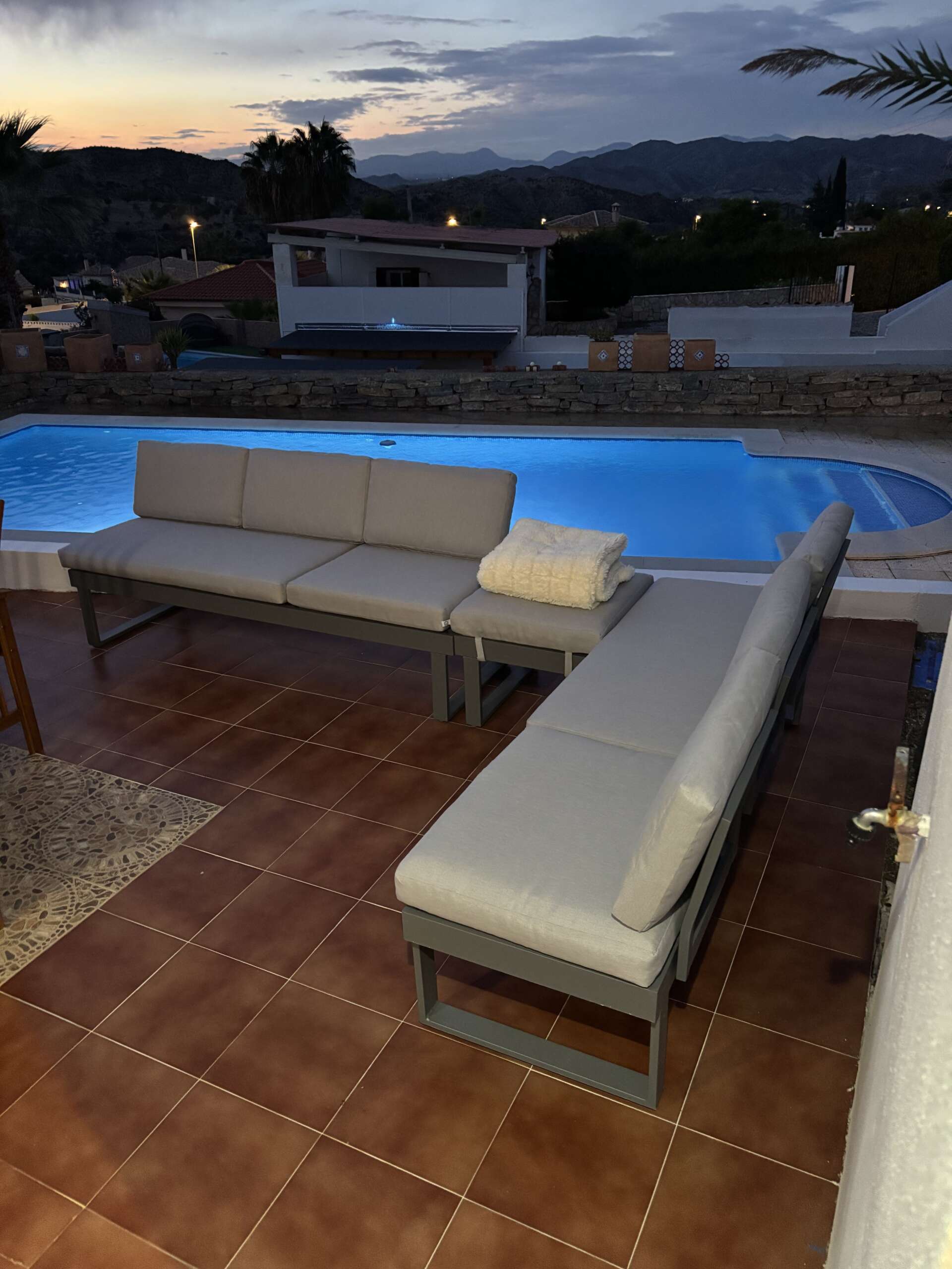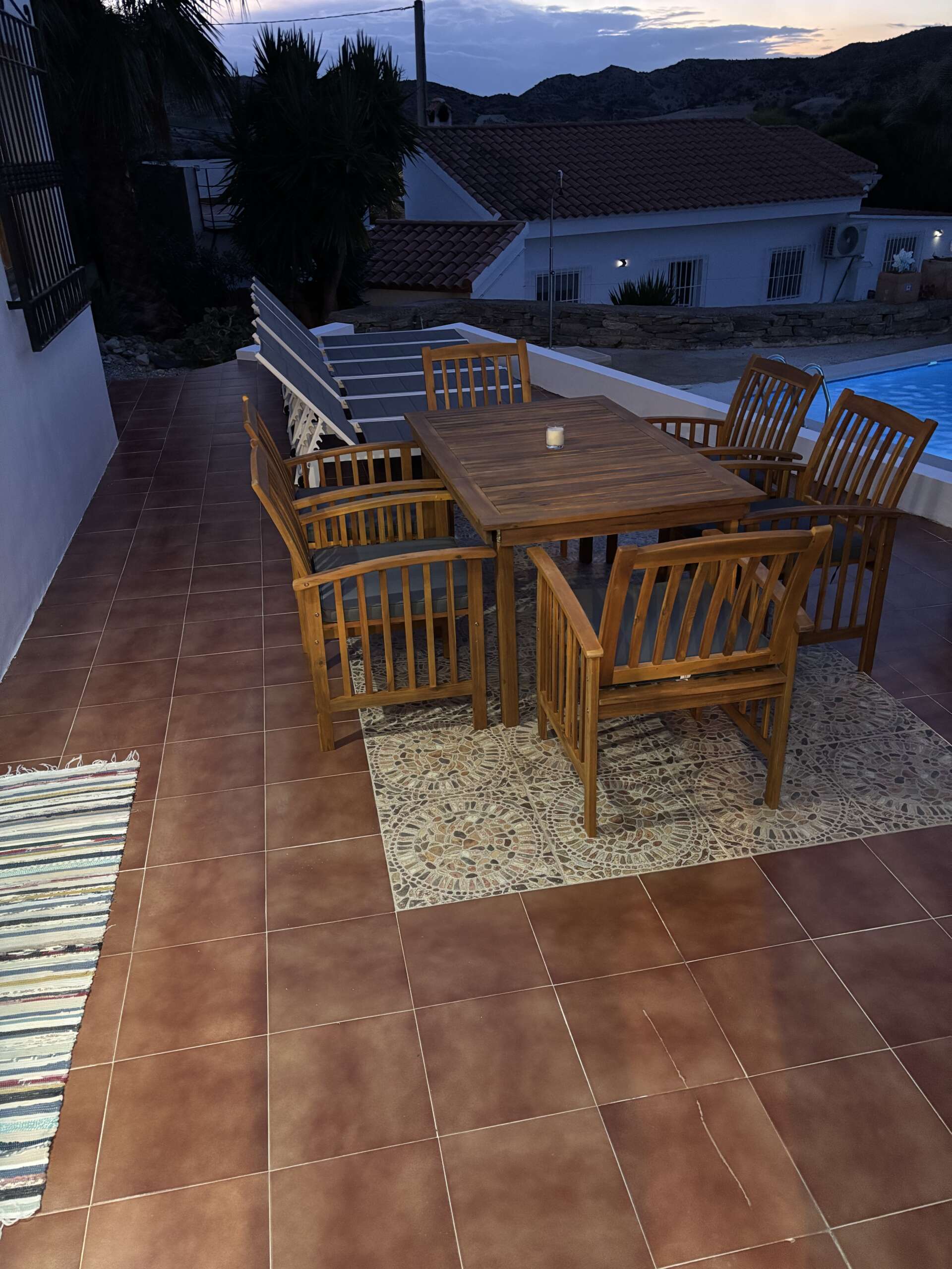There is a terrace off the lounge with dining table and chairs around the swimming pool. BBQ available.
